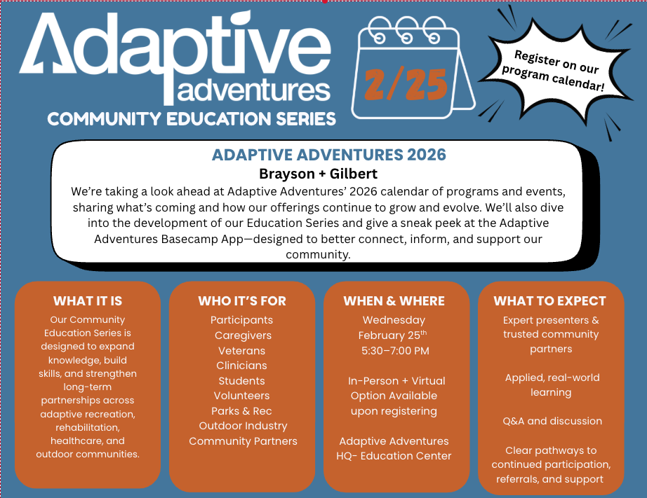 We’re taking a look ahead at Adaptive Adventures’ 2026 calendar of programs and events, sharing what’s coming and how our offerings continue to grow and evolve. We’ll also dive into the development of our Education Series and give a sneak peek at the Adaptive Adventures Basecamp App—designed to better connect, inform, and support our community.